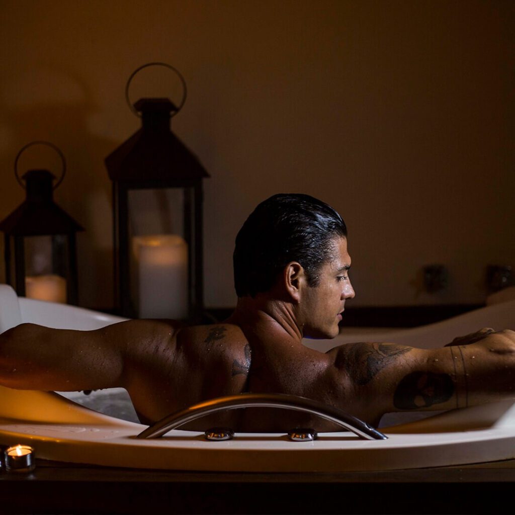 Depois, ele mergulha em uma banheira com hidromassagem, aromas calmantes e iluminação suave.
